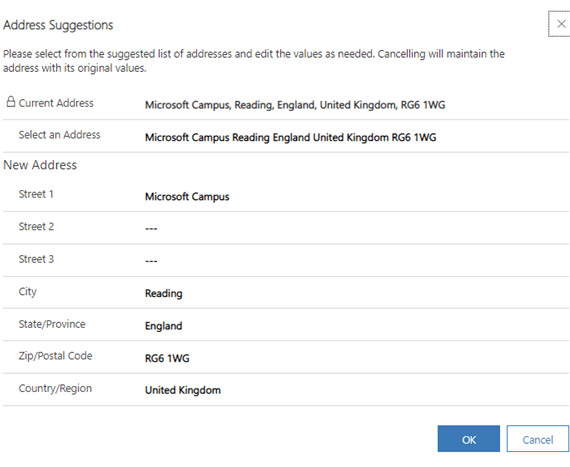 When the maps are enabled the user shall get address suggestions when populating the Account or Contact address as shown below: