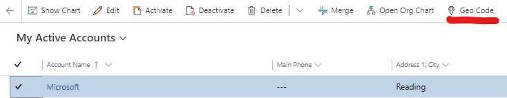 If the longitude and latitude aren’t populated, it is possible to force this by selecting the Geocode button on the command bar on the record as shown below: